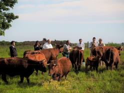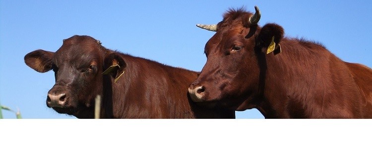 【写真:当社が飼養する短角牛。赤茶色の和牛で、季節によって体色が変化し、夏場などは赤黒い色になります】