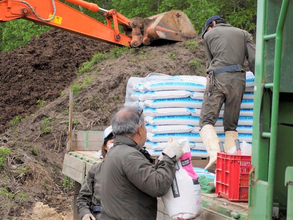 堆肥の一部は、購入した木くずと混ぜて牛舎に戻し、牛が寝るベッド(敷料)として使っています。この敷料は、通常は木くずなどを使用しますので、木くずの消費量を削減することができます。また、敷料には堆肥を分解する菌が混ざり込み、牛舎内の糞・尿までもが分解されるため、牛舎内には臭いがなく、牛にも人にも快適な環境です♪